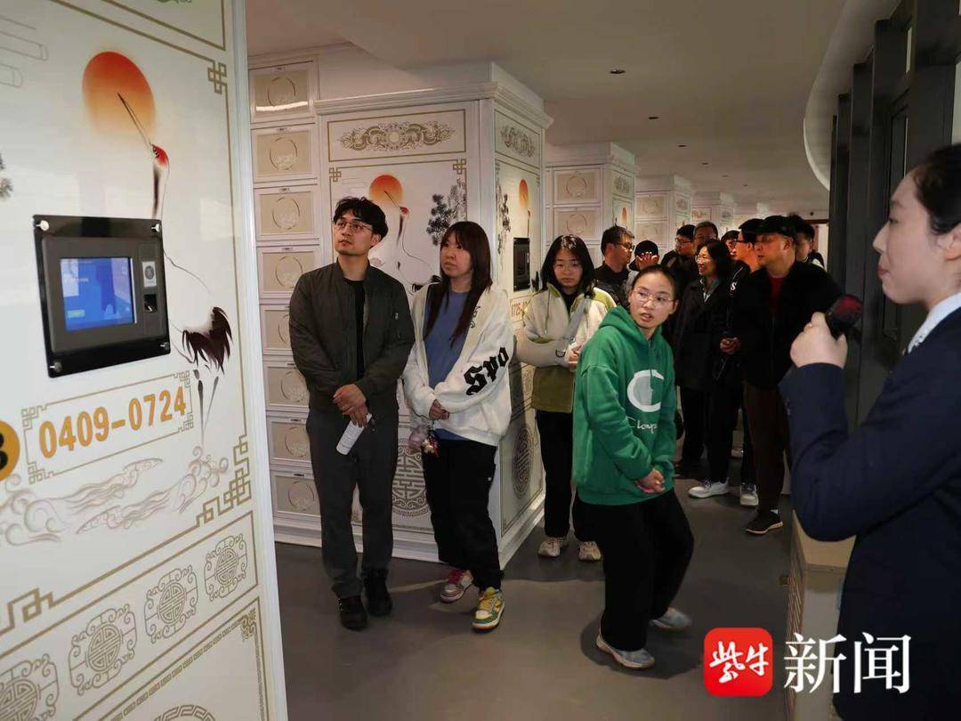 走进南京城市公益性骨灰纪念堂,代表们第一眼看到的,是一排排整洁庄重的柜体,面板上绘着精致的松鹤图画,寓意健康长寿、吉祥如意,也寄托着对生命圆满的朴素祝愿。细节之处,更见温情。考虑到选择较高格位的家属祭扫时可能不便,纪念堂在每个通道旁都贴心地配备了梯子,方便家属亲手擦拭、近距离寄托思念。服务过程中,工作人员还会为每位家属送上一张“追思卡”。这是一张电子芯片卡,轻轻一刷,格位外门便缓缓开启,透过内门玻璃,亲人骨灰盒安放其中的样子清晰可见。